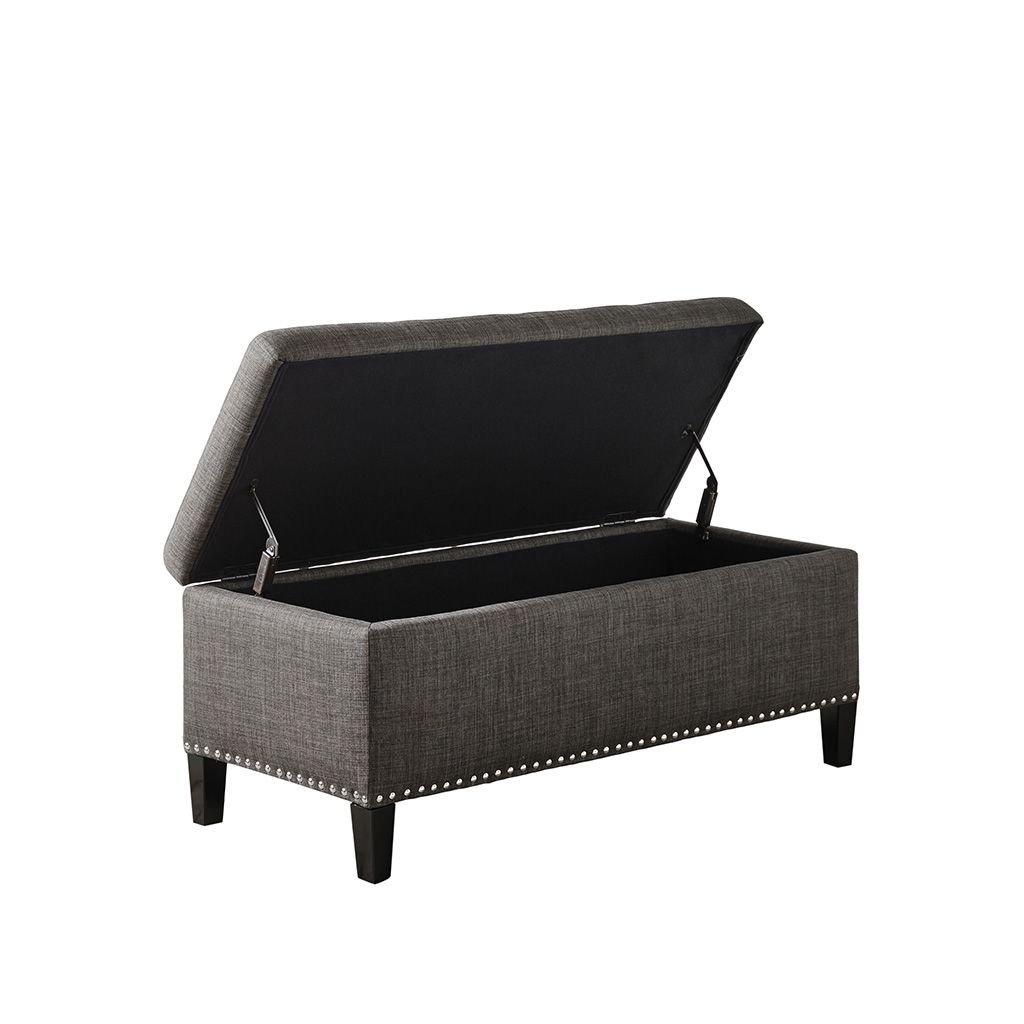 This modern storage ottoman accentuated with button tufting provides ample storage and features an elegant grey linen fabric with black noir legs. Assembly required.
