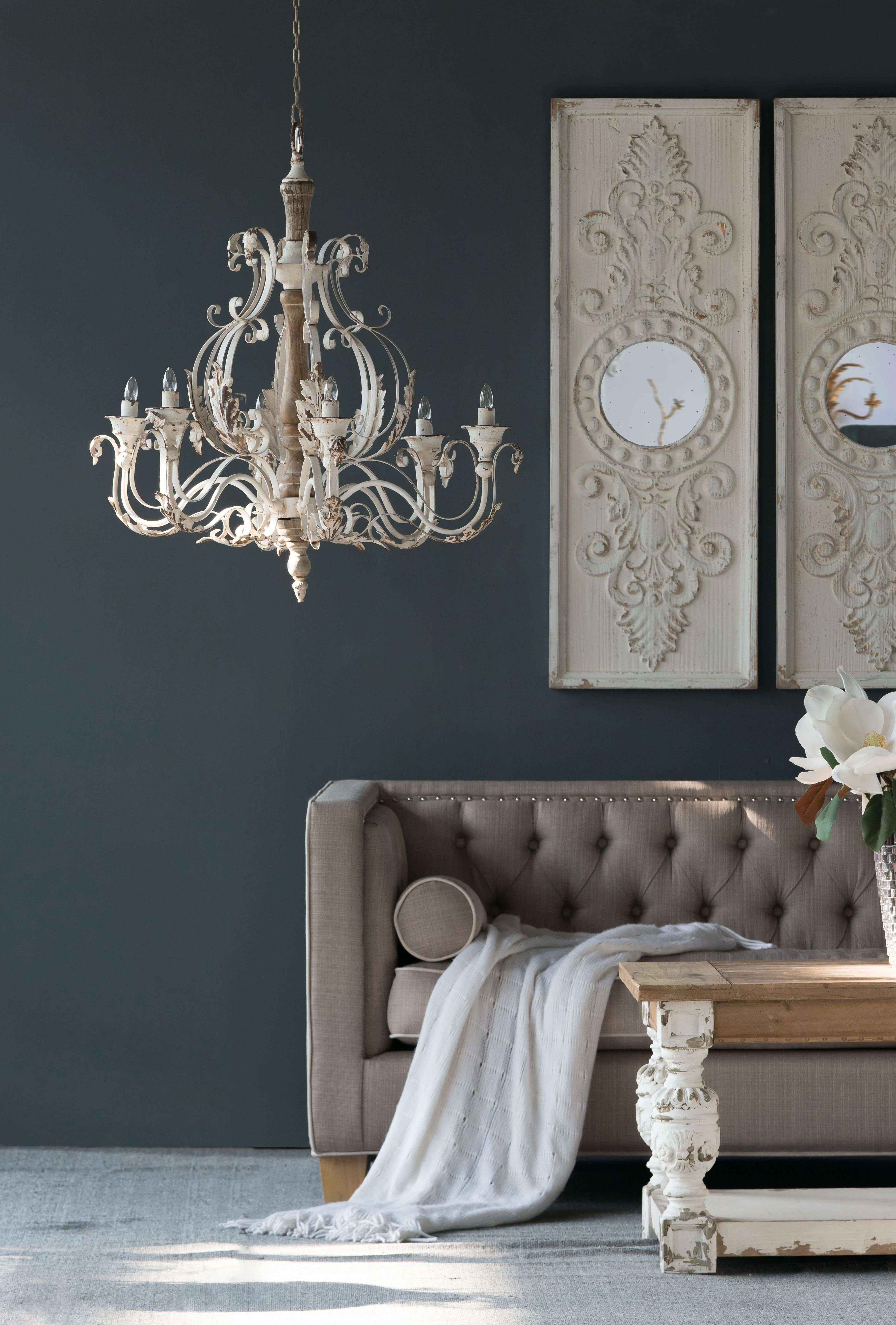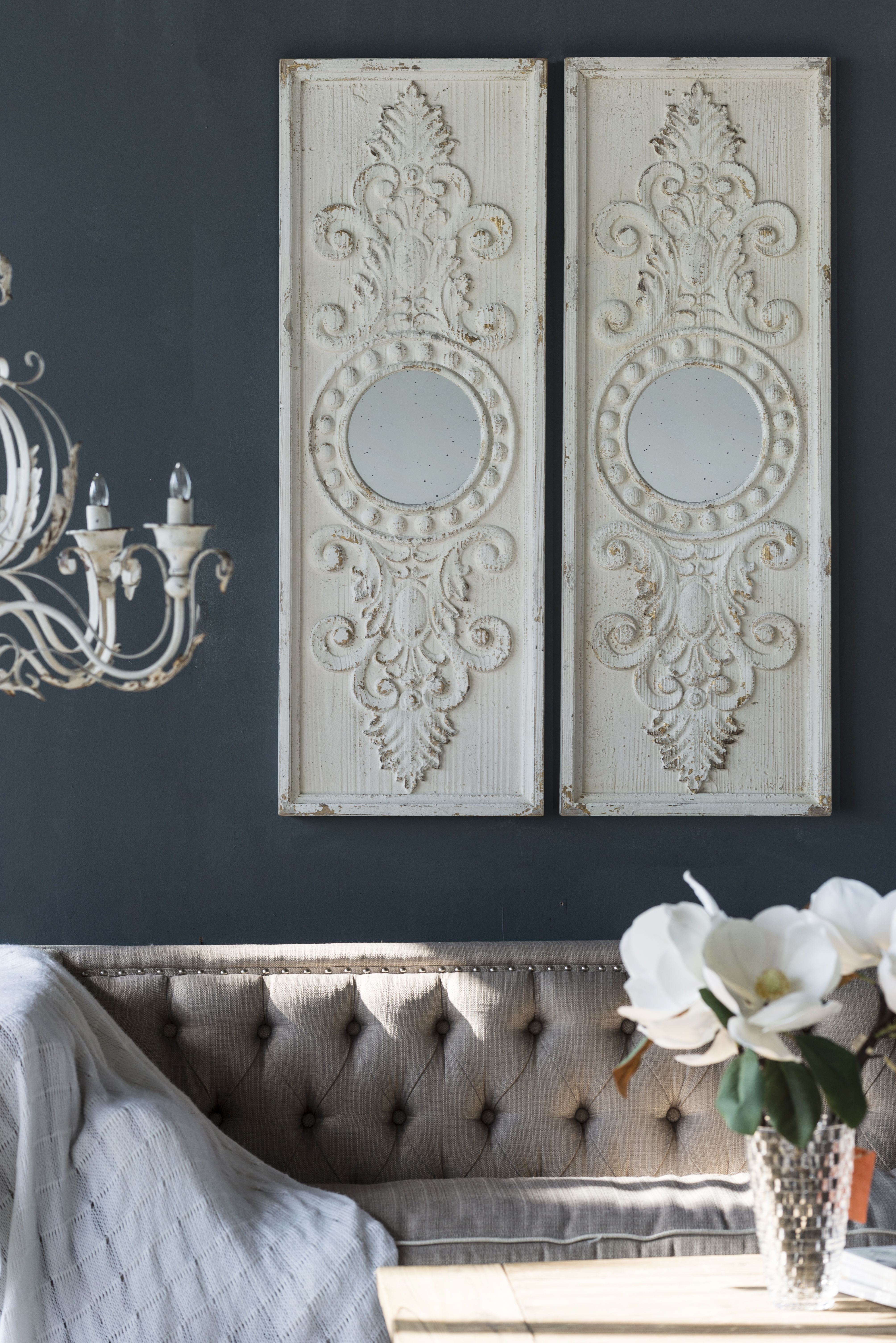 These decorative wall panels can add a sense of personality and nostalgia to any space. The solid fir wood frames feature elegant scrollwork, finished in distressed white for character and vintage flair. Whether they are displayed side by side as a bold focal point or separated throughout your home, this set is sure to command the gaze of your guests.