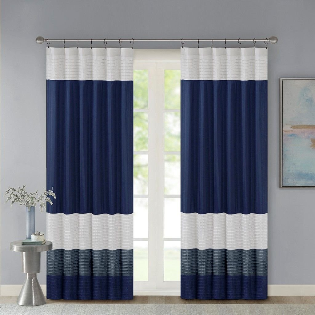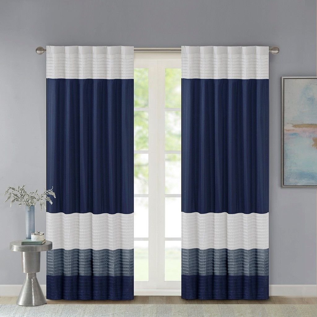 Madison Park Amherst Polyoni Pintuck Window Curtain is a simple way to add style to your room. This window panel features a modern striped design in deep hues of navy, ivory, and slate combined with pintuck detailing for beautiful texture and dimension. The added lining helps filter the perfect amount of light and creates fullness for better drapability. Simply hang using rod pocket or with back tabs for a tailored look. This window curtain fits up to a 1.25" diameter rod.