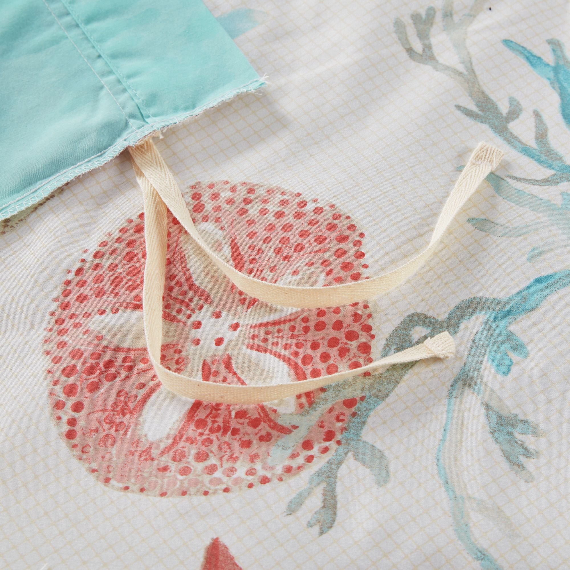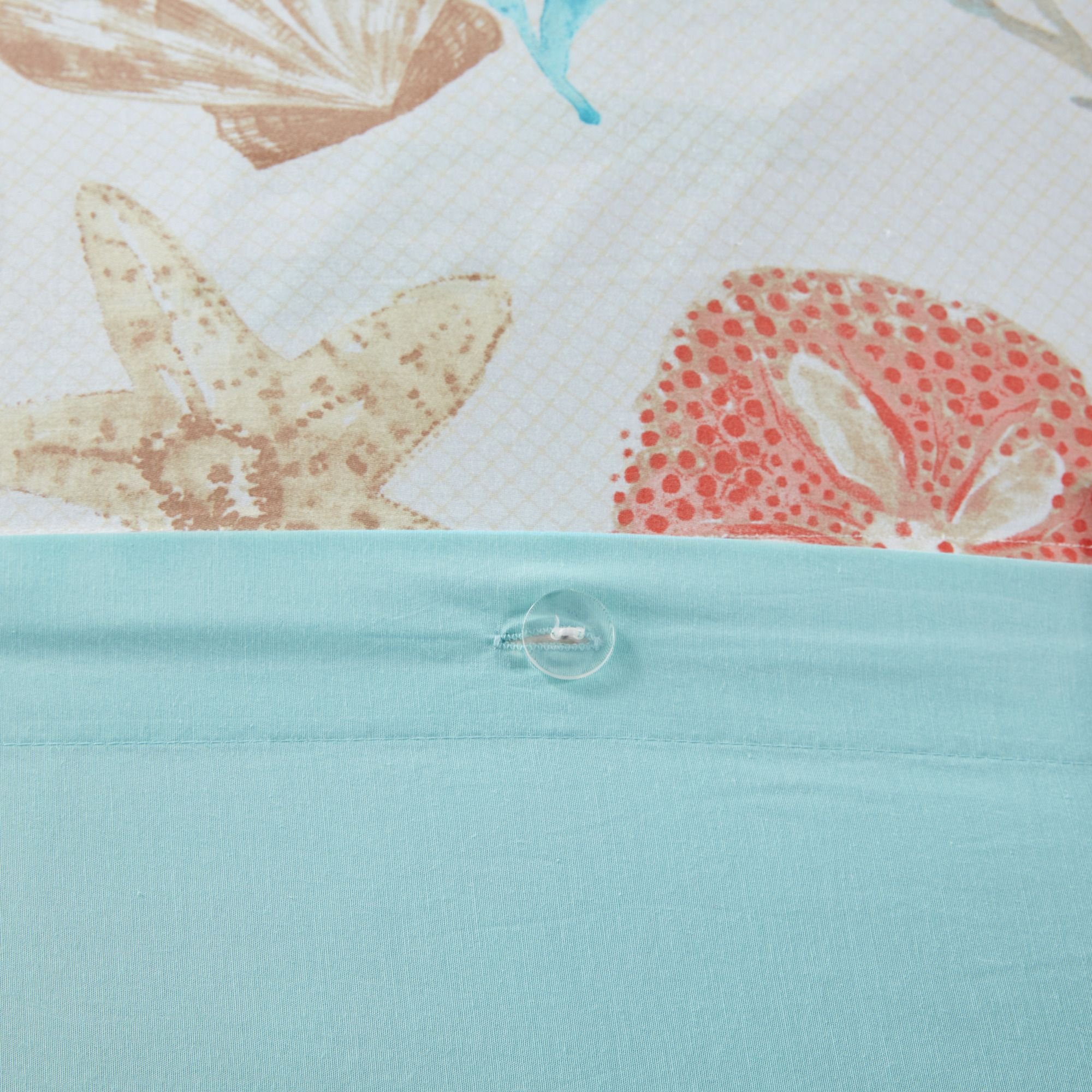 For a vibrant coastal update to your bedroom, the Pebble Beach 6 Piece Cotton Sateen Duvet Cover Set is perfect for you! This coastal duvet cover features all over printed shells, starfish, and coral in aqua, teal, and taupe colors to brighten your space. The soft cotton/polyester reverse is a solid taupe that adds a touch of neutral color that complements the coastal design. The 2 matching shams beautifully coordinate with the cotton duvet cover to complete the coastal look. Also included are 3 decorative pillows with coastal embroidery details that add dimension to the top of the bed. This cotton duvet cover set is OEKO-TEX certified, meaning it does not contain any harmful substances or chemicals to ensure quality comfort and wellness. Machine washable for easy care, this luxurious costal bedding provides a refreshing and relaxing addition to your bedroom decor. A button closure at the foot end secures a padded insert within the duvet cover and inside corner ties prevent it from shifting (insert is NOT included).