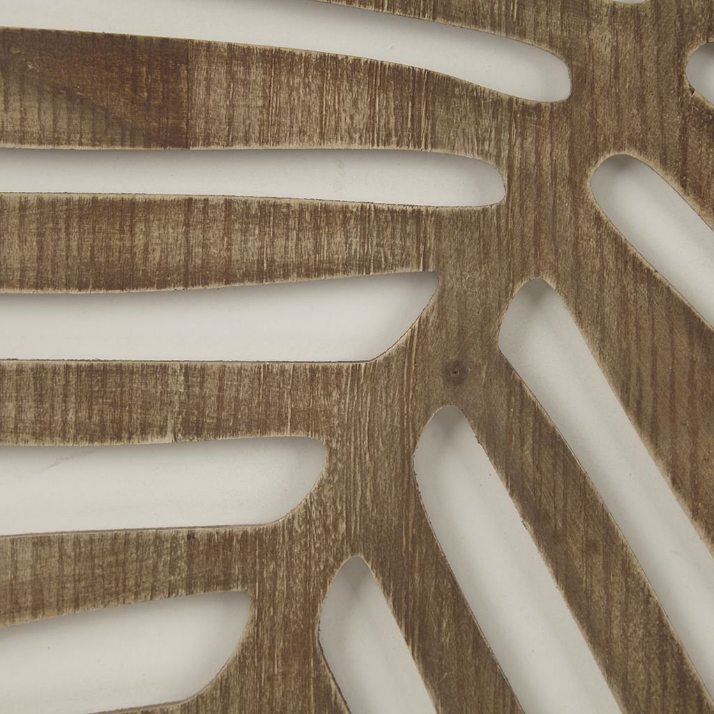 Dimensional wall art panel set with palm leaf design in a natural wood tone on on a contrast white ground