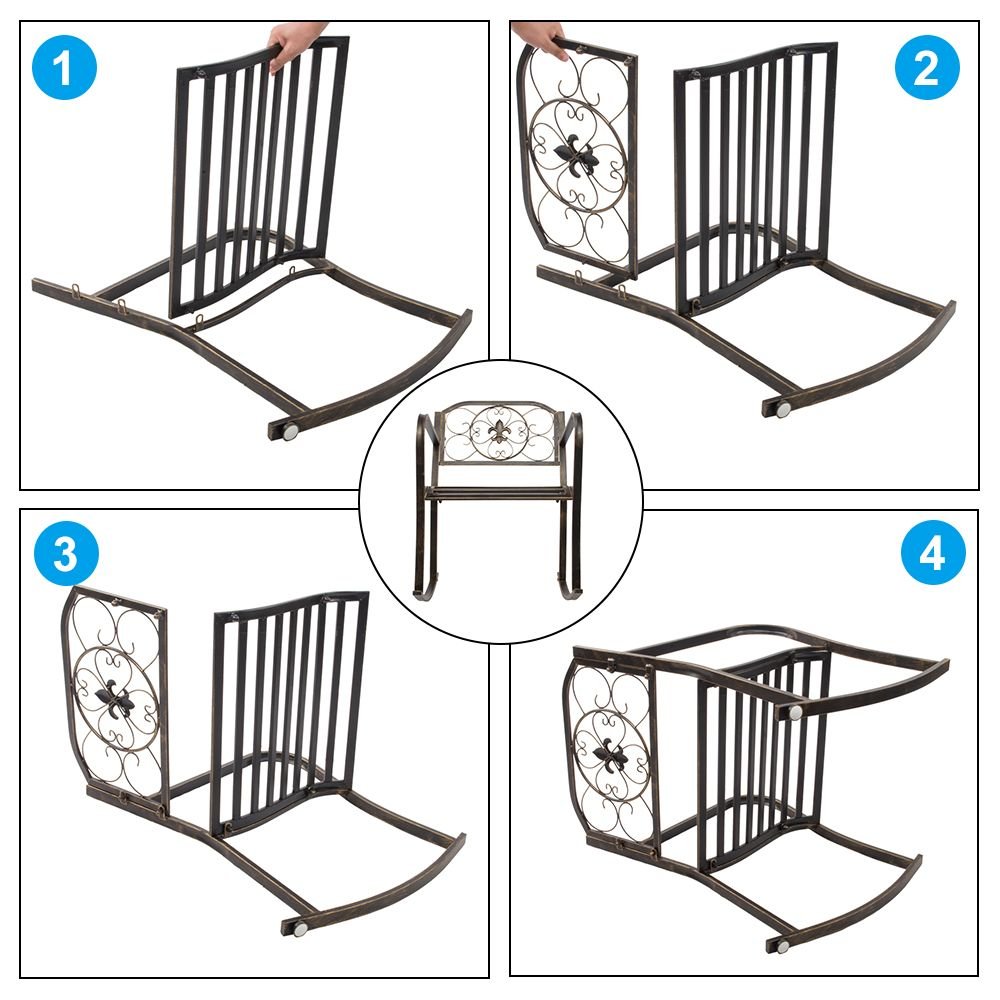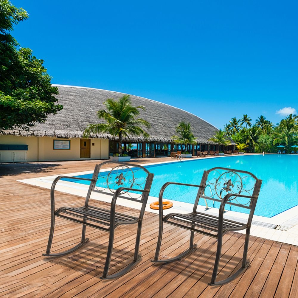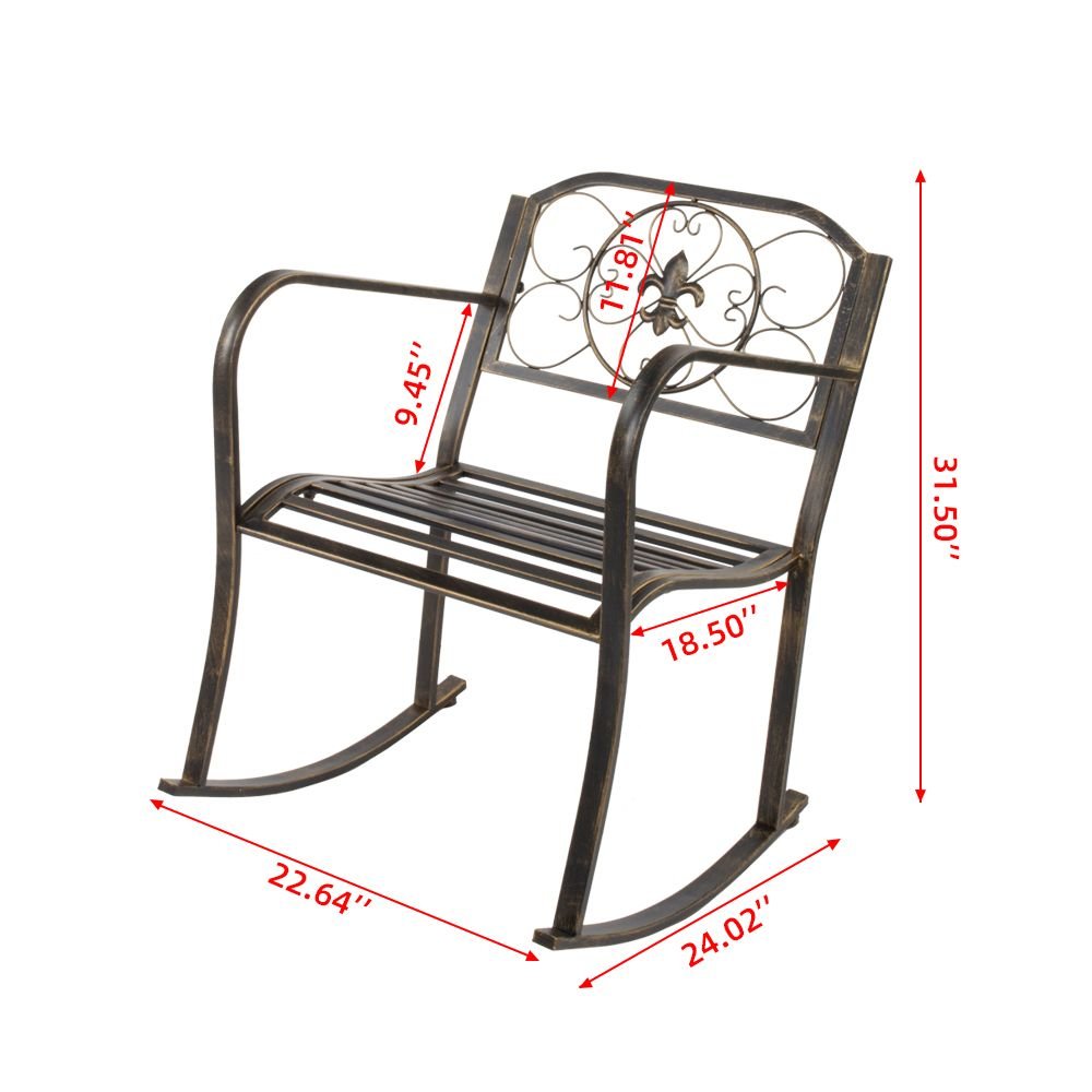 This beautifully designed Rocking Chair complements any outdoor setting, perfect for a backyard or front porch area. Relax and enjoy a soothing cup of morning coffee on our patio rocking chair. The simple and classic design provides a comfortable rocking motion setting. Made of lightweight yet sturdy wrought iron, this chair is made to last while making any outdoor setting look attractive. Enjoy the fresh breeze of a sunny spring day or a summer night while sitting and having a conversation with a loved one.