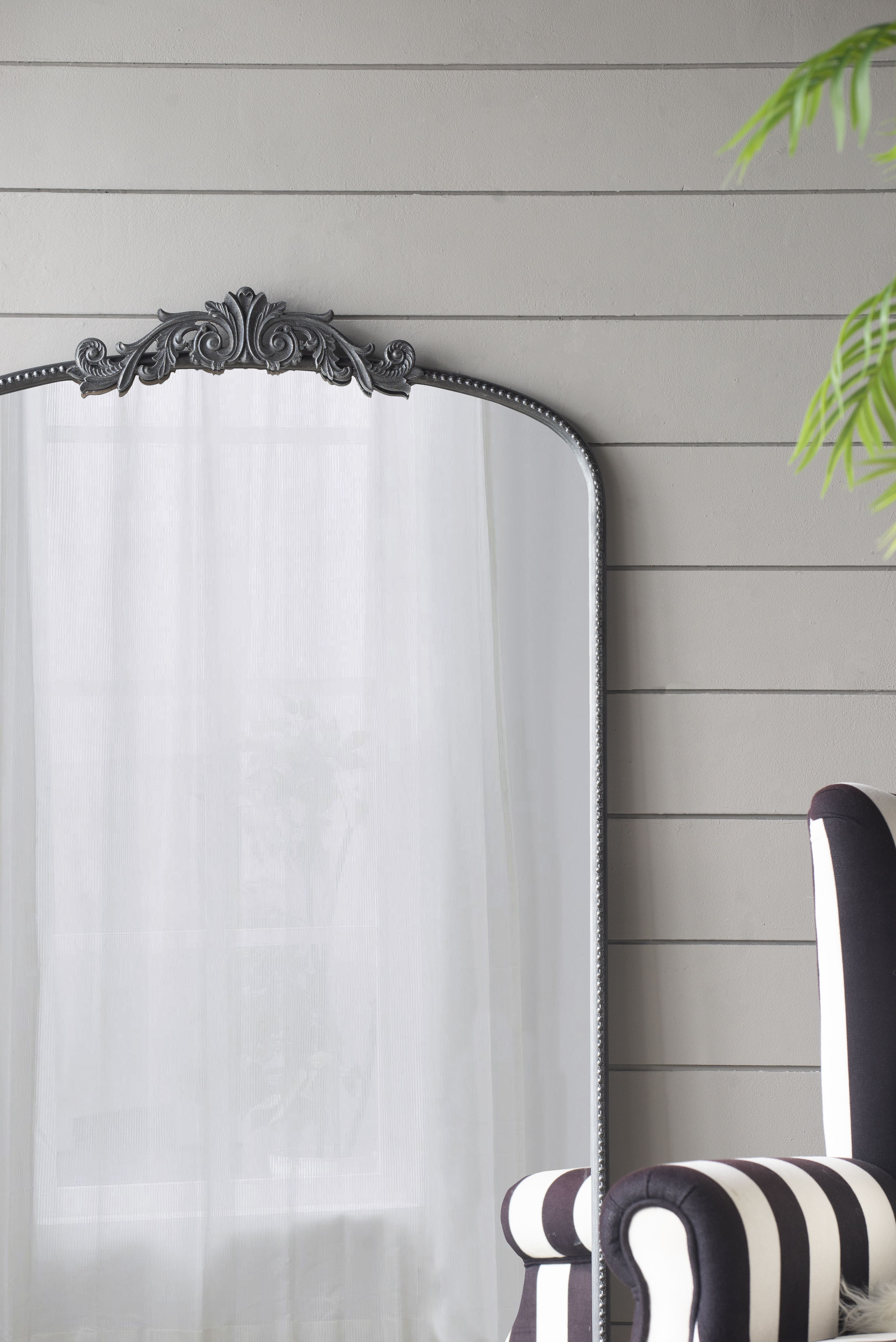 Boasting a grand arched silhouette, a smooth black frame, and an intricately crafted regal adornment at the head, this full-length mirror blends classic baroque style with versatile function. Measuring a large 66H x 36W x 2D, it will capture your whole reflection with ease while also elevating the decor in your living room or bedroom.
