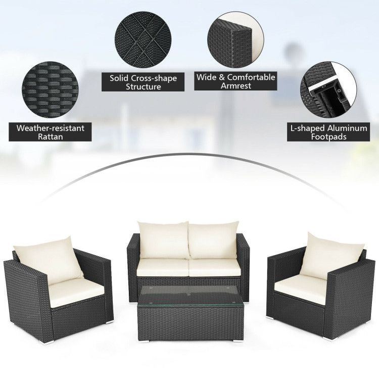 4 Pieces Patio Rattan Conversation Set with Padded Cushion