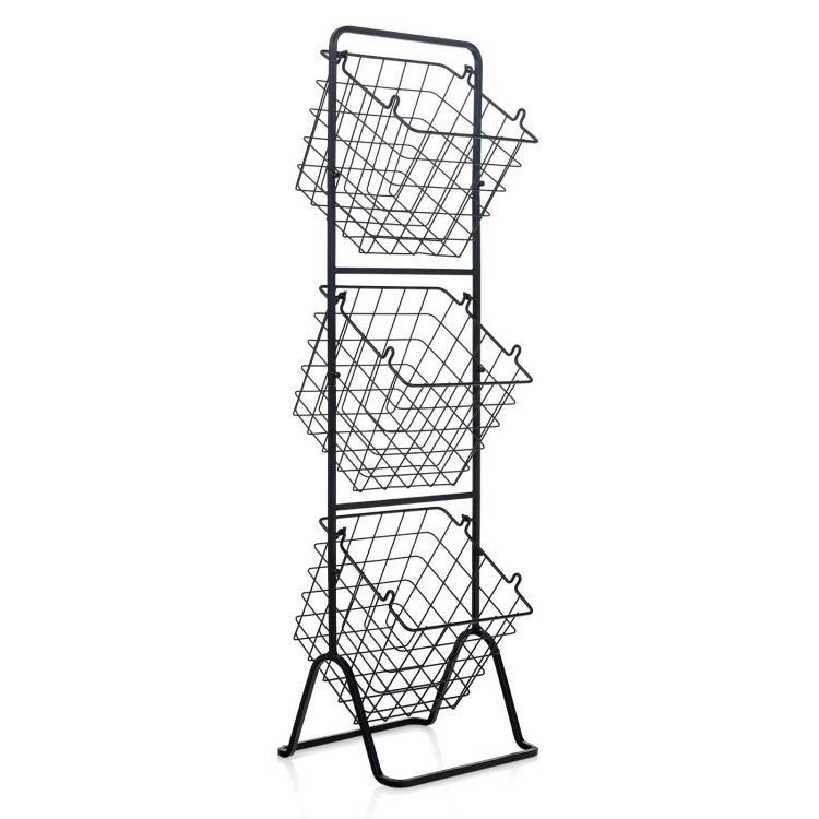 This 3-tier market basket stand provides sufficient room to stock up on various items. It can organize vegetables, and fruit in your kitchen, classify snack bags in the living room, assort laundry detergent near the washing machine, not to mention store other sundries. The wire basket features a tilted hanging design for easy fetch and is easy to remove for independent use. It is easy to connect the frame and hang up the baskets, then the assembly is finished! This fruit basket stand converts to 3 height forms --- 1-basket, 2-basket and 3-basket, which is an ideal organizing solution for specific needs. The stable triangle metal base and rounded corner will ensure safe use.