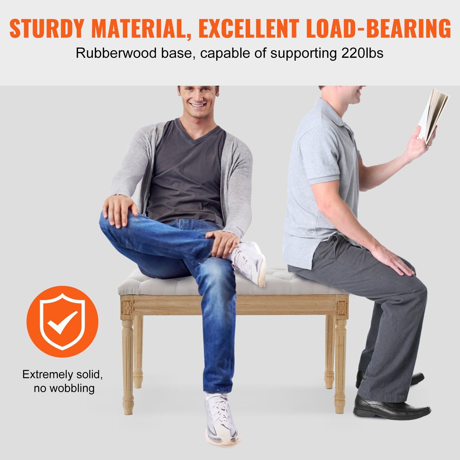 This end of bed bench is built with a sturdy rubberwood base that supports up to 220Lbs (approximately 100kg), safely accommodating two people without fear of collapse.