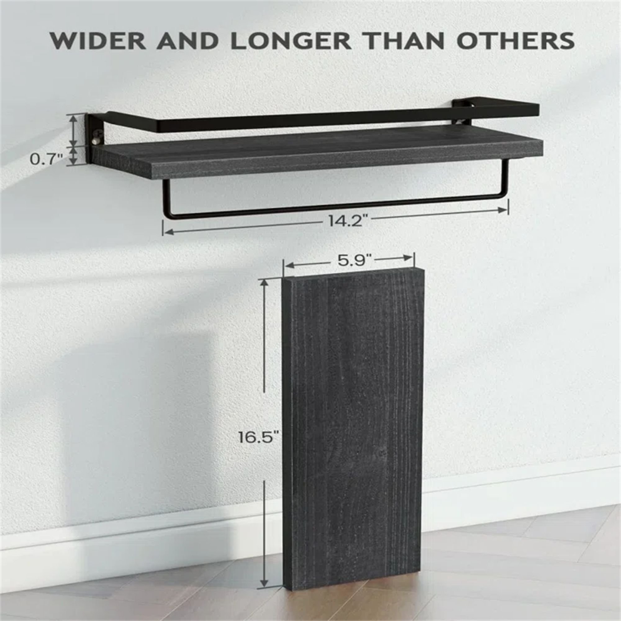 Crafted with Paulownia wood, powder-coated metal bracket, and torched finish, the floating shelves are sturdy and strong enough for holding 40lbs of items. Decor and organized your home more beautifully and neatly. Step 1, unfold the bracket; step 2, install the board and the towel bar; step 3, affix the bracket on the wall. Applicable wall: Wood Stud, Drywall, Concrete Wall.