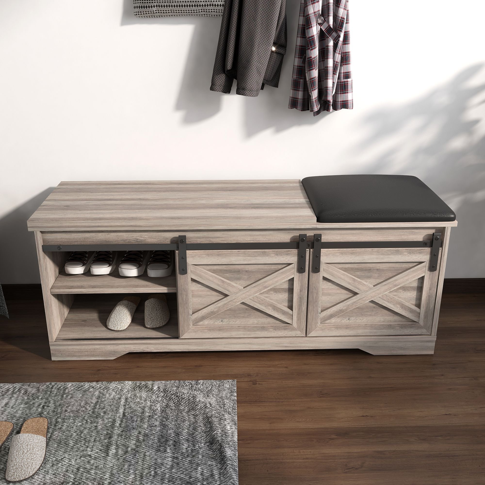 Home > WESOME 47 Inch Modern Farmhouse Sliding X Barn Door Litterbox Bench with Entry Cutout; Shoe Bench Multi-color Option