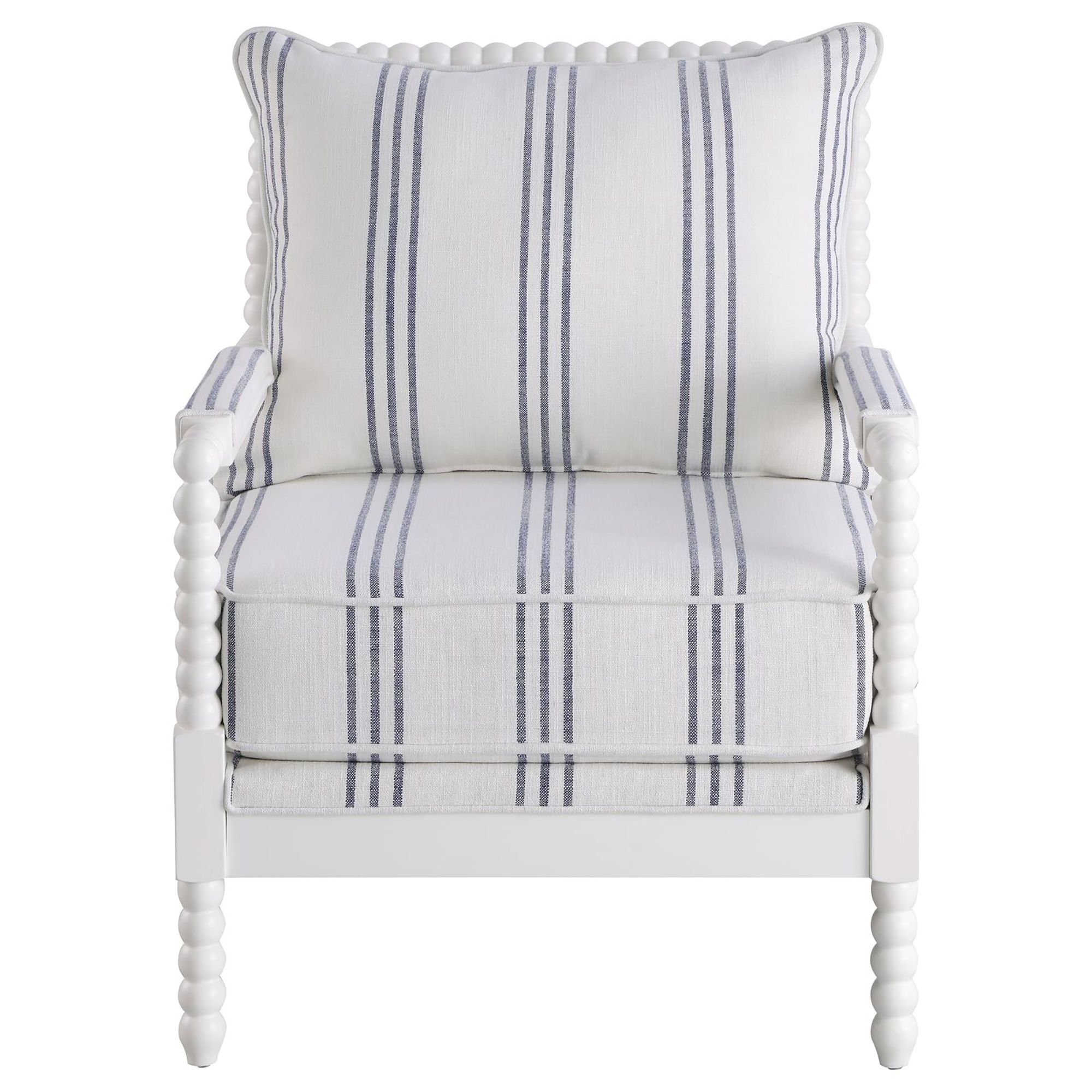 Nautical vibes stand out in the accent chair, featuring a stark white frame and linen-like cushions with navy striped accents. Ideal for coastal style homes and cottages, this accent chair features a charming stacked-sphere spindle design along the padded arms, front feet and backrest, offering a unique visual interest.