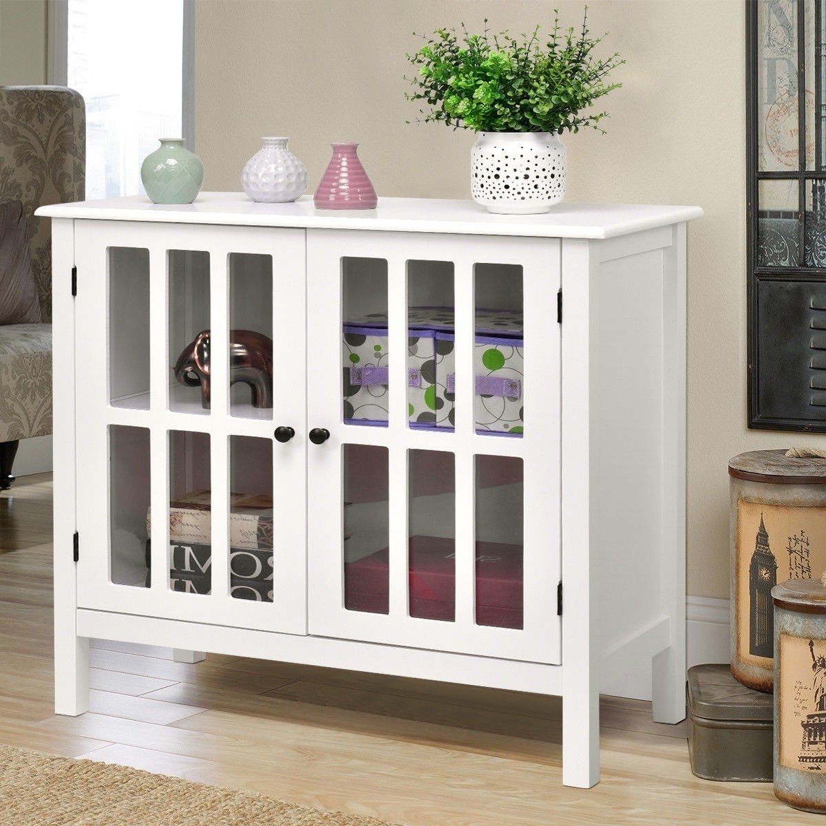 • White Wood Sideboard Buffet Cabinet with Glass Panel Doors